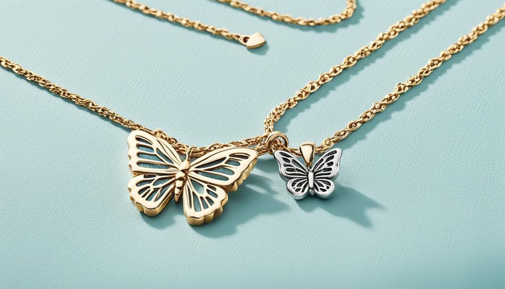 The Elegant Chain Necklace with Butterfly Charm mixes elegance and flexibility. It’s a top pick for your jewelry box. Its design, with the butterfly charm, means change and fresh starts. This makes it a meaningful gift for many occasions.