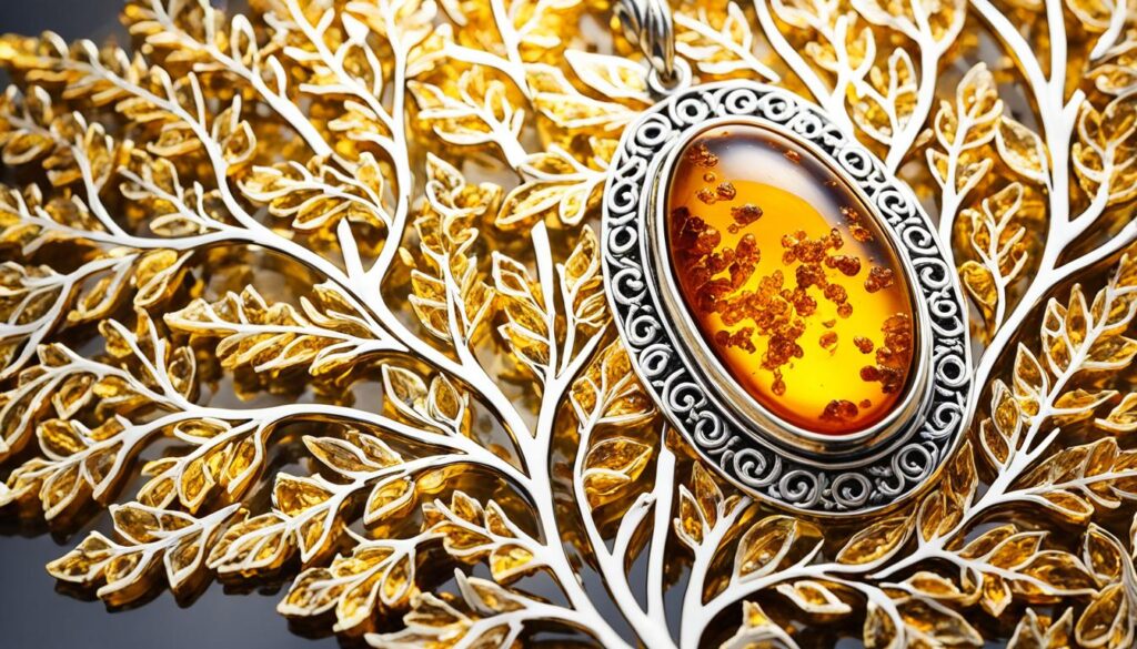 The amber gemstone is special because of its long history and how it’s made. It started as tree resin and turned into the unique piece you see. Each piece has its own designs and additions. This makes every amber item special and loved for its connection to nature.